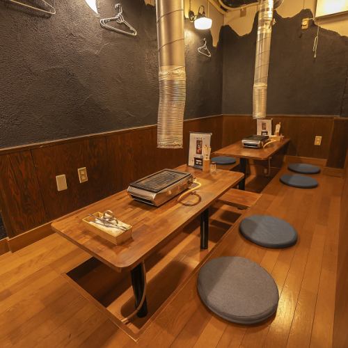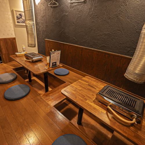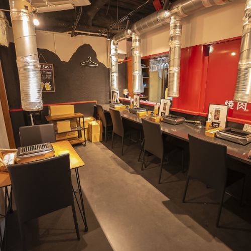 【お一人様やデートに最適】 大人の隠れ家のような空間を贅沢に味わえるカウンター席。暗めのトーンで落ち着いた店内で、お肉と会話に集中できるよう設計されています。職人の技を眺めながら、高級感あふれる雰囲気の中で、お肉を堪能したい方におすすめです。
